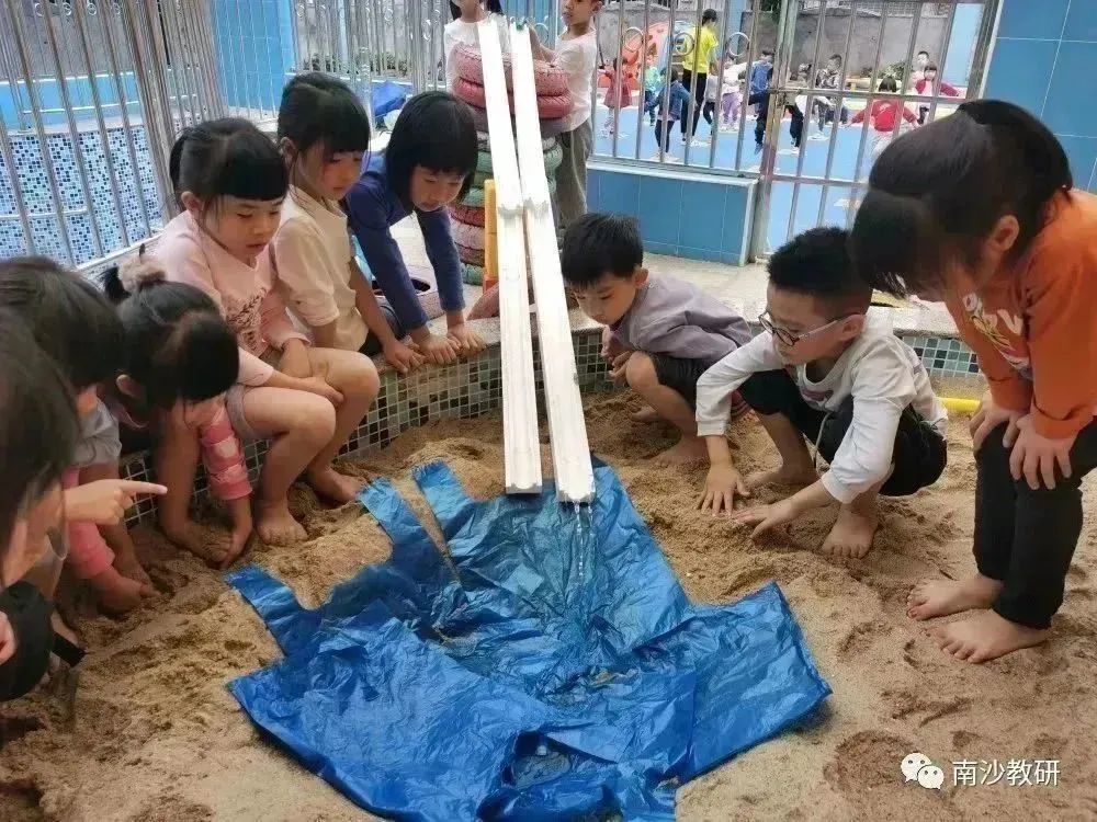 黎学超(潭洲中心幼儿园教师):在玩沙游戏中,孩子发现玩沙的铲子和小车上粘满了沙,于是开始商量要清洗玩沙工具。听了孩子们的话,我很惊喜,他们不仅发现了沙、水的特性以及沙和水之间的关系,还知道用塑料袋、雨伞等能防水的物品来蓄水,在游戏中不断运用已有经验进行探索,获得新的经验。