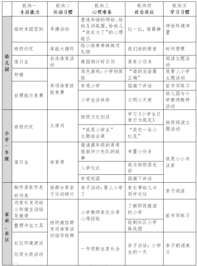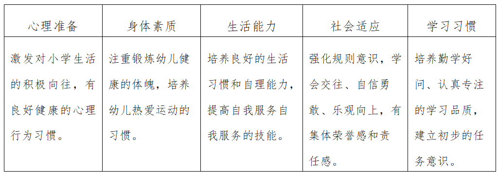 关注幼儿身心健康、学习品质及社会性发展等关键素质的入学准备;实现家庭幼小衔接教育的一致性、幼儿园和小学的双向衔接。