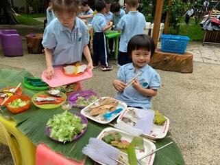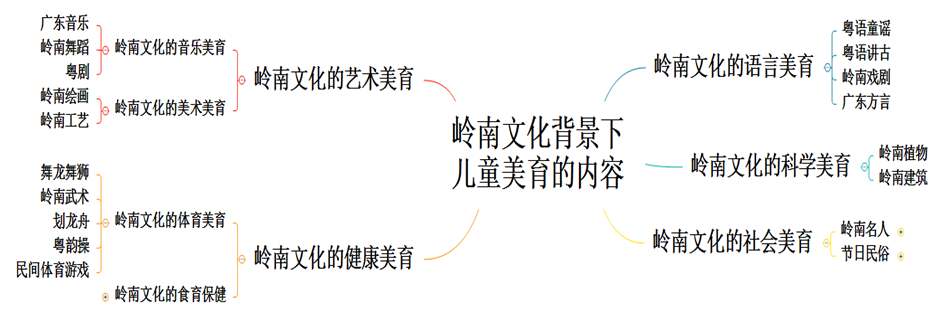 在美育课程的探索与实践过程中,我院在观念上从艺术教育向“以美陶情、以美辅德、以美益智、以美健体、以艺促美”的大美育观转变;在内容上从单一的艺术美育向“自然美育”“艺术美育”以及“生命美育”的立体建构转变;在途径上从“接受式”向“体验式”美育转变。秉承价值性、适宜性、兴趣性、自然性、生活性以及发展性的原则,我院逐渐建构起岭南文化的艺术美育、健康美育、语言美育、科学美育以及社会美育的课程架构体系。