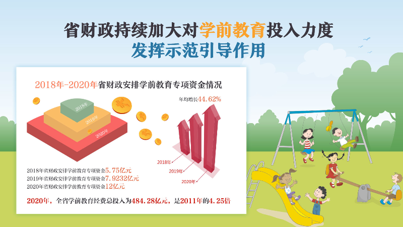 全省学前教育经费保障能力明显增长。2020年,全省学前教育经费总投入为484.28亿元,是2011年的4.25倍,明显高于在园幼儿数增幅。在各级各类教育中,学前教育经费增幅最快。省财政持续加大对学前教育投入力度,发挥示范引导作用。2018-2020年省财政安排学前教育专项奖补经费分别为5.75亿元、7.9232亿元和12亿元,年均增长44.62%。