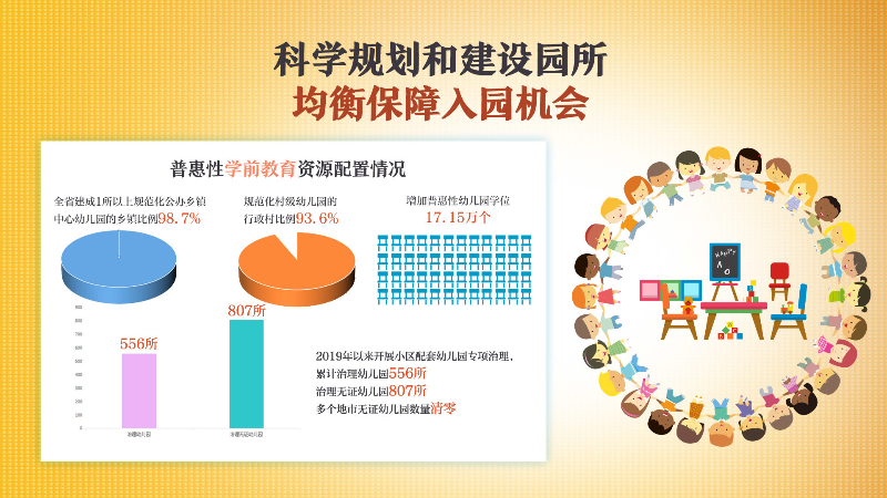 民生举措二:均衡保障入园机会。加强公办乡镇(街道)中心园和村级园建设,全省建成1所以上规范化公办乡镇中心幼儿园的乡镇比例达98.7%建成规范化村级幼儿园的行政村比例达93.6%2019年以来开展小区配套幼儿园专项治理,累计治理幼儿园556所,增加普惠性幼儿园学位17.15万个。治理无证幼儿园807所,多个地市无证幼儿园数量清零。