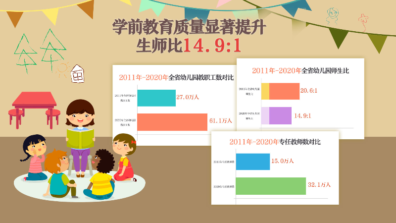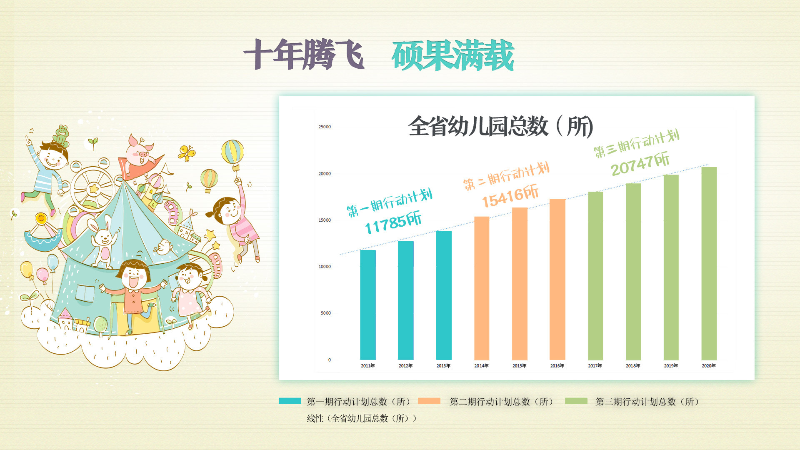 2011年全省启动第一期发展学前教育三年行动计划之初,全省幼儿园数仅为11785所,2014年启动第二期行动计划时达到15416所,2017年启动第三期行动计划时达到18048所,至2020年底第三期行动计划结束时达到20747所,十年期间幼儿园数年均增长7.6%。