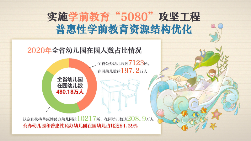 民生举措二:均衡保障入园机会。加强公办乡镇(街道)中心园和村级园建设,全省建成1所以上规范化公办乡镇中心幼儿园的乡镇比例达98.7%,建成规范化村级幼儿园的行政村比例达93.6%。2019年以来开展小区配套幼儿园专项治理,累计治理幼儿园556所,增加普惠性幼儿园学位17.15万个。治理无证幼儿园807所,多个地市无证幼儿园数量清零。