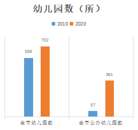 普惠性学前资源快速增长。2010年全市各级各类幼儿园586所,2020年702所,增加116所;2010年公办幼儿园(含公办性质幼儿园)57所,2020年公办幼儿园(含公办性质幼儿园)361所,增加304所。2020年底全市公办幼儿园在园幼儿占比达52%,公办幼儿园和普惠性民办幼儿园在园幼儿占比达88%.全市公办学前教育资源紧缺和“上公办园难”的问题得到一定缓解。