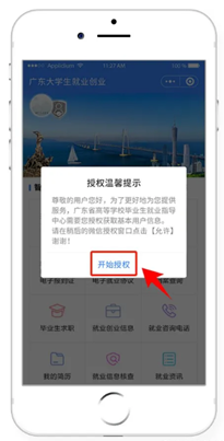 1.进入“广东大学生就业创业”官方小程序988Pay自动显示授权温馨提示,点击“开始授权”弹出小程序授权窗口。