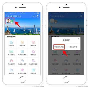 1.进入“广东大学生就业创业”官方小程序,在988Pay左上角找到“用户登录”,点击后出现两个弹窗“中国内地学生”“港澳台学生”,选择“港澳台学生”。