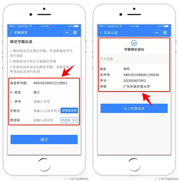 3.“刷脸”成功后,即可进行“学籍绑定”,点击“完成”可进入“个人信息”绑定的操作。