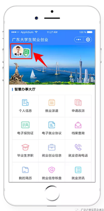 搜索“广东大学生就业创业”官方微信公众号并点击关注,进入菜单栏“办事大厅”。
