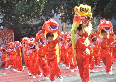 广东醒狮是极具岭南特色的民间艺术,每逢节庆或重大活动必有醒狮助兴。我院幼儿在非遗文化传承人和教师的指导下自制形态各异的小狮子,并高举着自制的200多头小狮子带来了壮观而又震撼的“狮子操”。