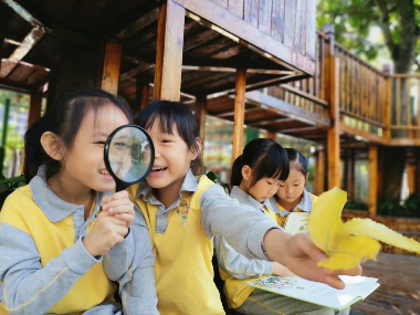 (左图)专注投入的“小画家”——狮山罗村学知园幼儿园的幼儿绘画活动(右图)幼儿自主游戏-透过放大镜,我看到了不一样的树叶