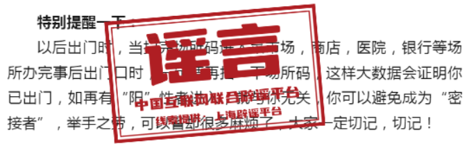 微信群里流传着一则“特别提醒”:“进入菜市场、商店、医院、银行等场所办完事后出门时,一定要再扫一下场所码,这样大数据就会证明你已出门,如果再有阳性病例进入就与你无关,可以避免成为密接者……大家一定要转发!”